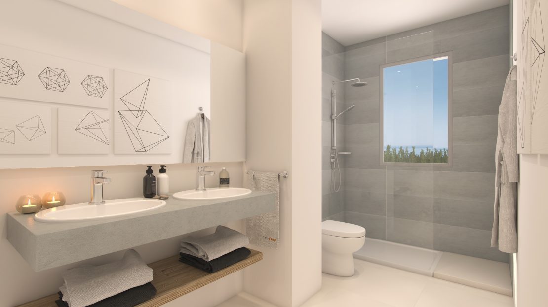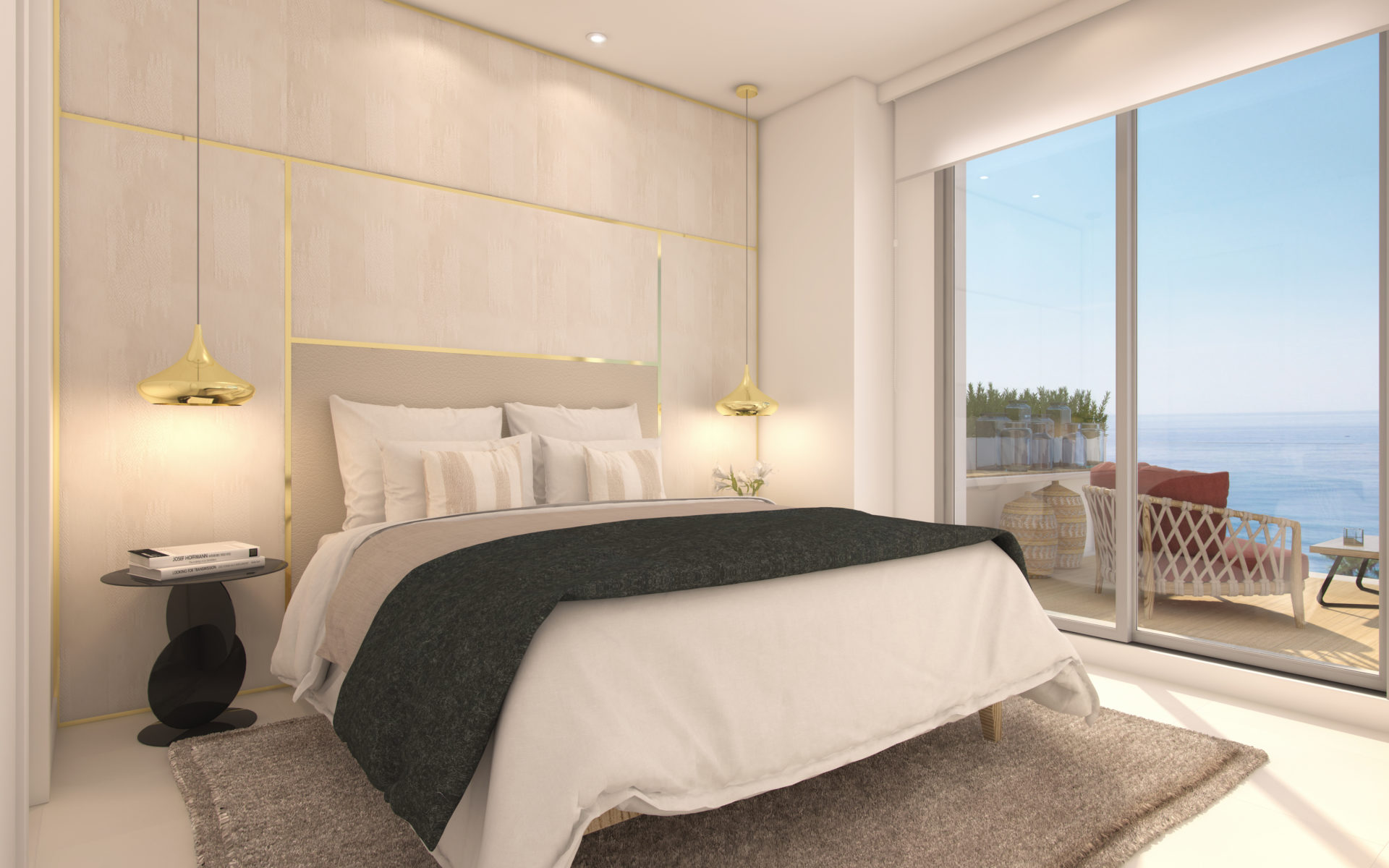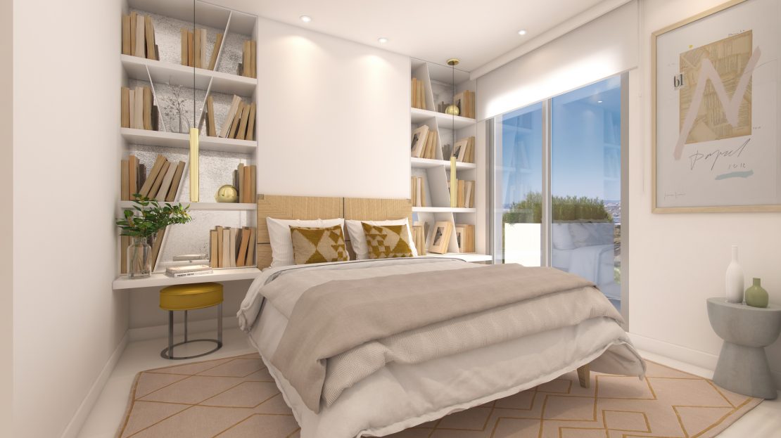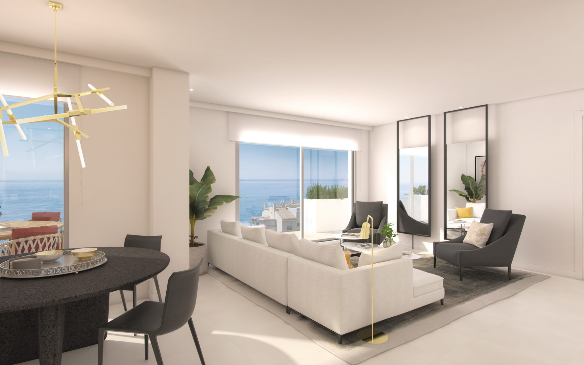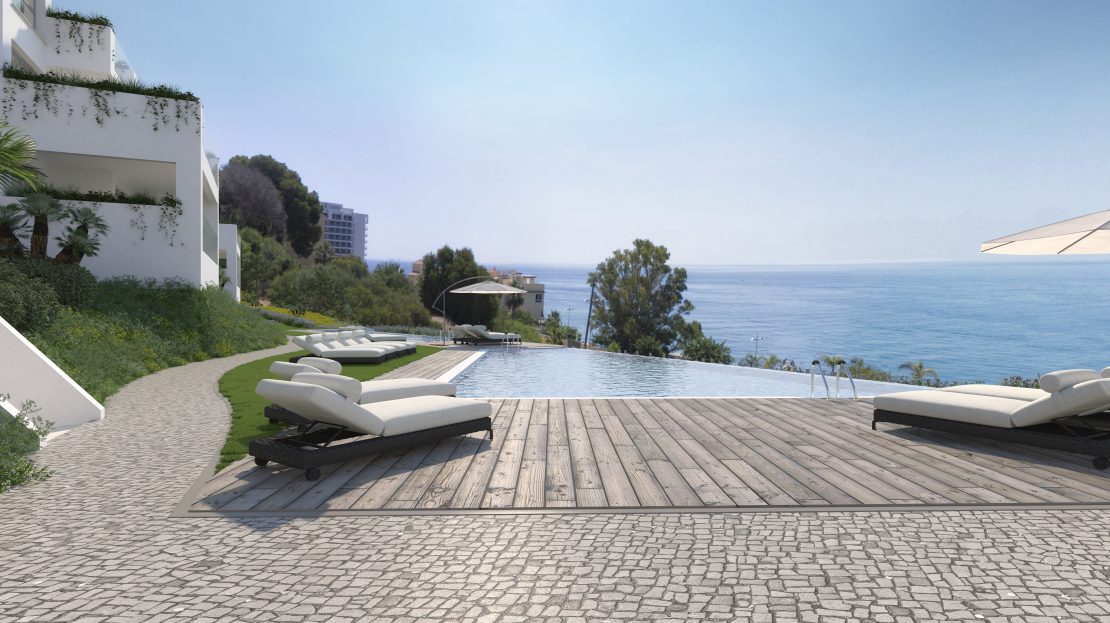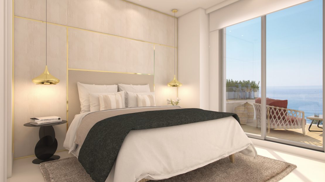 À seulement 100 mètres de la plage, et grace à une position sur-élevée, la plupart des appartements bénéficient d’une vue sur la mer à l’horizon de leurs terrasses et spacieuses zones vitrées.